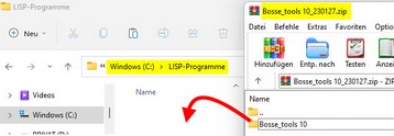 Die Datei wird auf die Ebene entzippt, in der das Bosse_tools 10 - Programmverzeichnis bei Ihnen vorhanden ist, z.B. c:/LISP-Programme/