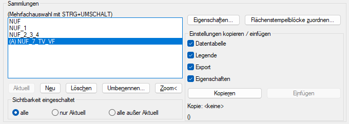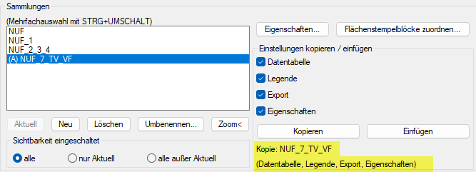 Es darf nur eine Sammlung selektiert sein. Von dieser Sammlung werden alle Einstellungen, die über die Kontrollhäkchen aktiviert sind, aus der Sammlung kopiert. Unter dem Button wird nach erfolgreicher Kopie angeschrieben, von welcher Sammlung die Kopie stand, sowie die beinhalteten Einstellungen: