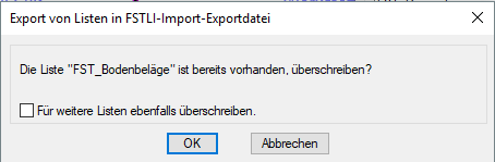 Es wird eine neue oder vorhandene FSTLI-Datei ausgewählt. Die selektierten Listen werden in die gewählte Datei exportiert, wenn eine Liste bereits in einer Datei enthalten ist wird gefragt, ob die Liste überschrieben werden soll: