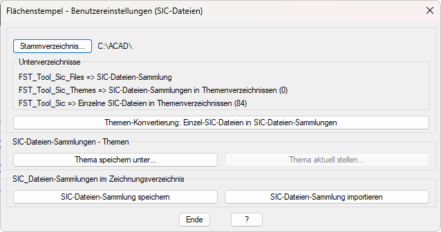 Die Einzel-SIC-Dateien aus den ausgewählten Themenverzeichnissen werden in SIC-Dateien-Sammlungen konvertiert. Gespeichert werden die SIC-Dateien-Sammlungen in namensgleichen Unterverzeichnissen in dem Verzeichnis C:/ACAD/FST_Tol_Sic_Themes/.