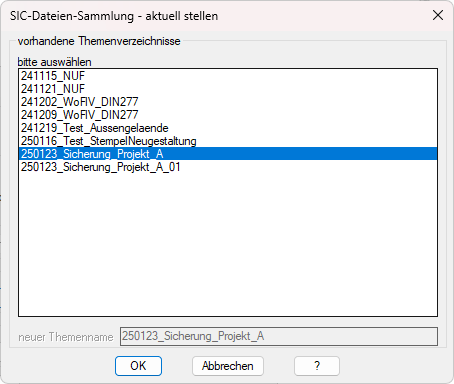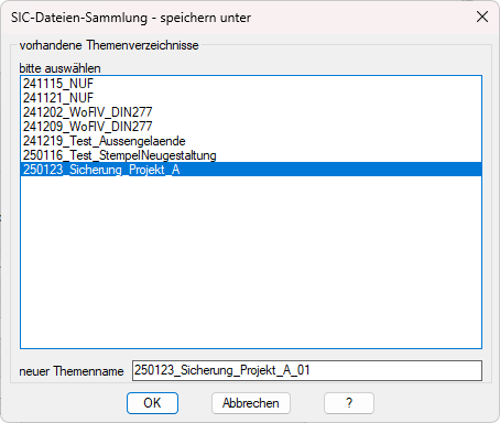 Wenn ein Projekt zu einem späteren Zeitpunkt weiterbearbeitet werden soll ist es sinnvoll, die zugrundeliegende SIC-Dateien-Sammlung im Zeichnungsverzeichnis zu speichern. Dann können die Einstellungen aus dieser SIC-Dateien-Sammlung zu einem späteren Zeitpunkt wiederhergestellt werden und das Projekt kann mit den ursprünglichen Einstellungen weiterbearbeitet werden.