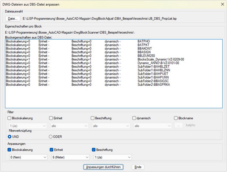 Mit dem Programm DwgBlockScanner aus dem AutoCAD-Magazin 6/2025 ist es möglich, ein Datei-Verzeichnis auszuwählen. Die Eigenschaften Blockskalierung, dynamischer Block, Beschriftungseigenschaft und Einheit können von allen enthaltenen DWG-Dateien (auch aus Unterverzeichnissen) ausgelesen und in eine Textdatei JB_DBS_PropList.lsp im LISP-Format geschrieben werden.