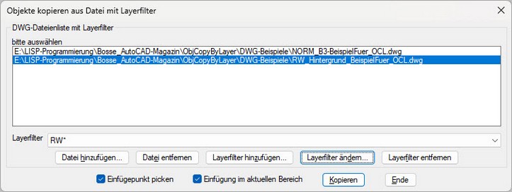 Mit dem Programm ObjCopyByLayer können die beiden Arbeitsweisen erledigt werden. Es werden bestehende DWG-Zeichnungen ausgewählt, pro Zeichnung können dann wiederum ein oder mehrere Layerfilter erstellt werden. Das Ziel ist es, Objekte aus diesen DWG-Zeichnungen in die aktuelle Zeichnung zu kopieren, und zwar nur Objekte, die dem aktuellen Layerfilter entsprechen.