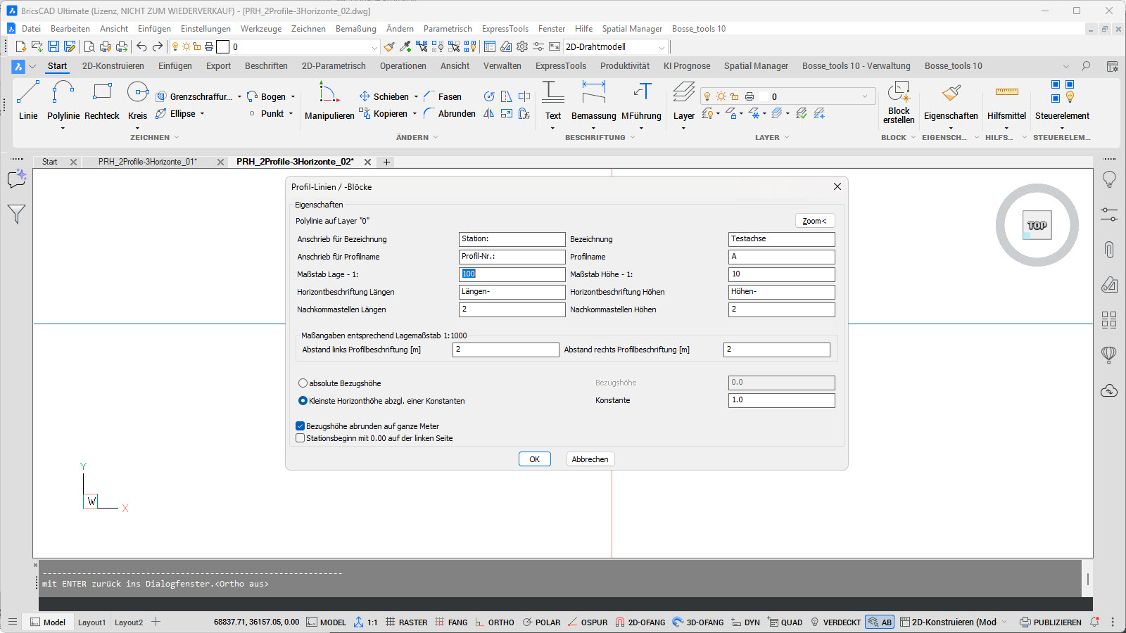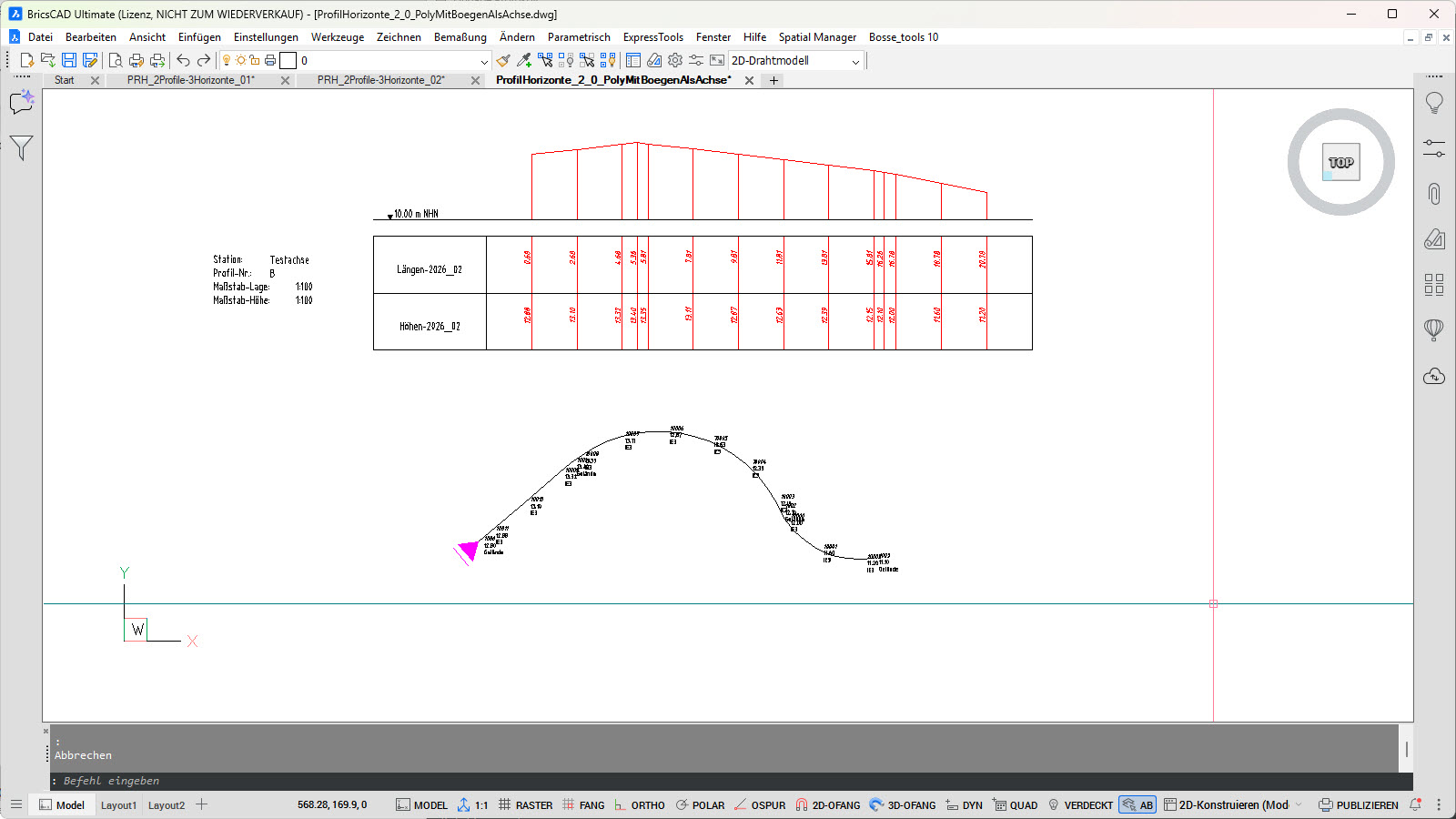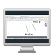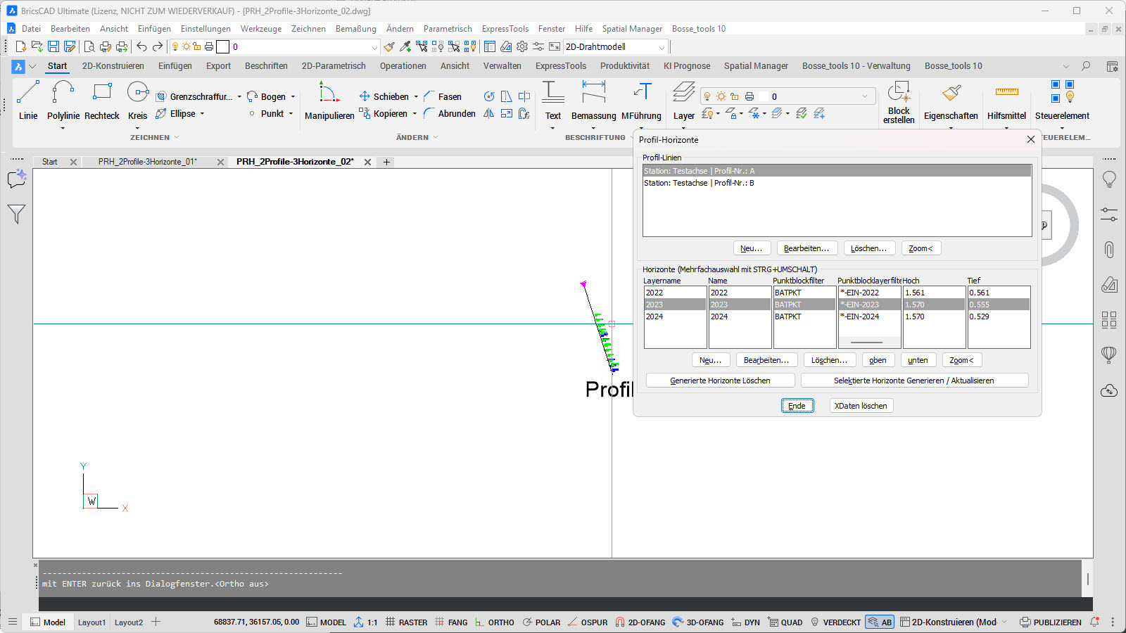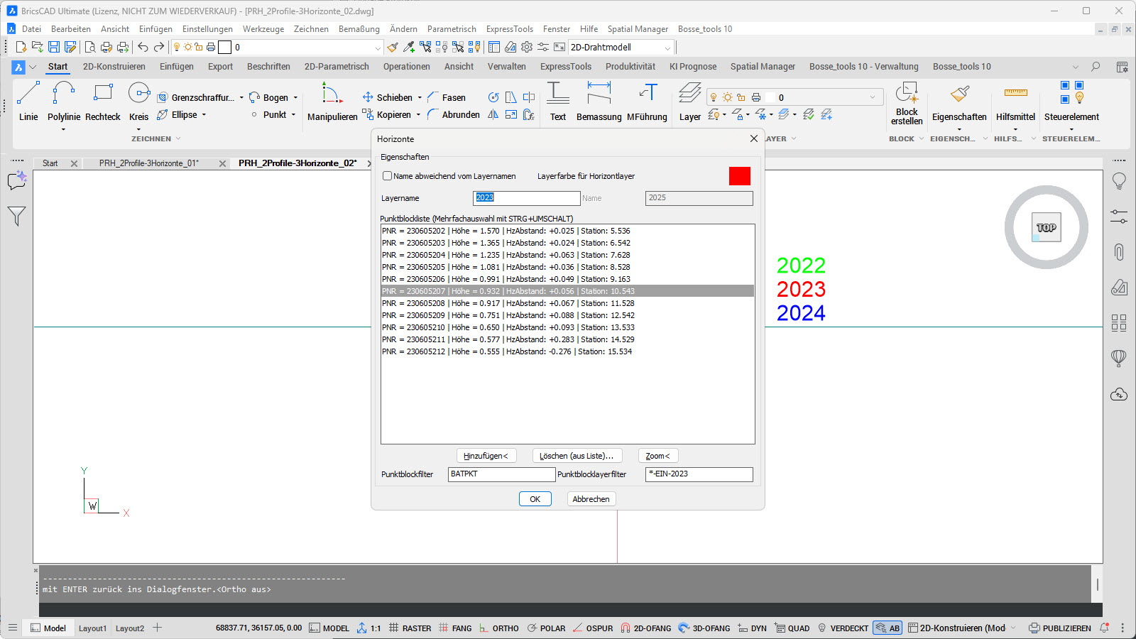 Zu jeder Profil-Linie können 1 oder mehrere Horizonte erstellt werden. Die Horizonte beinhalten die Koordinaten von 3D-Punktblöcken, die jeweils lotrecht auf die Profil-Linie angerechnet werden. Jeder Horizont kann in der Zeichnung erstellt werden, die zugehörigen Längen und Höhen werden beschriftet.