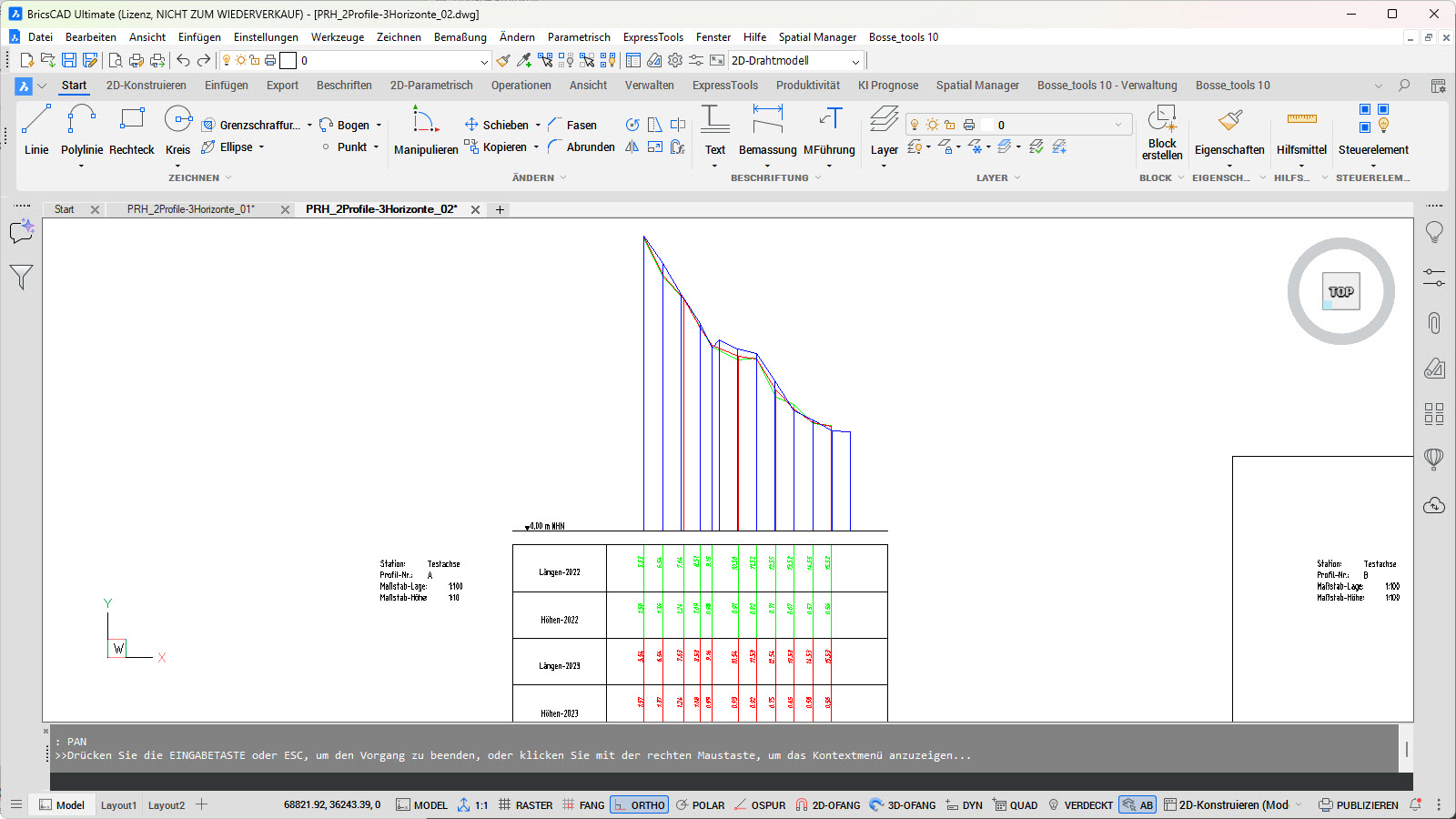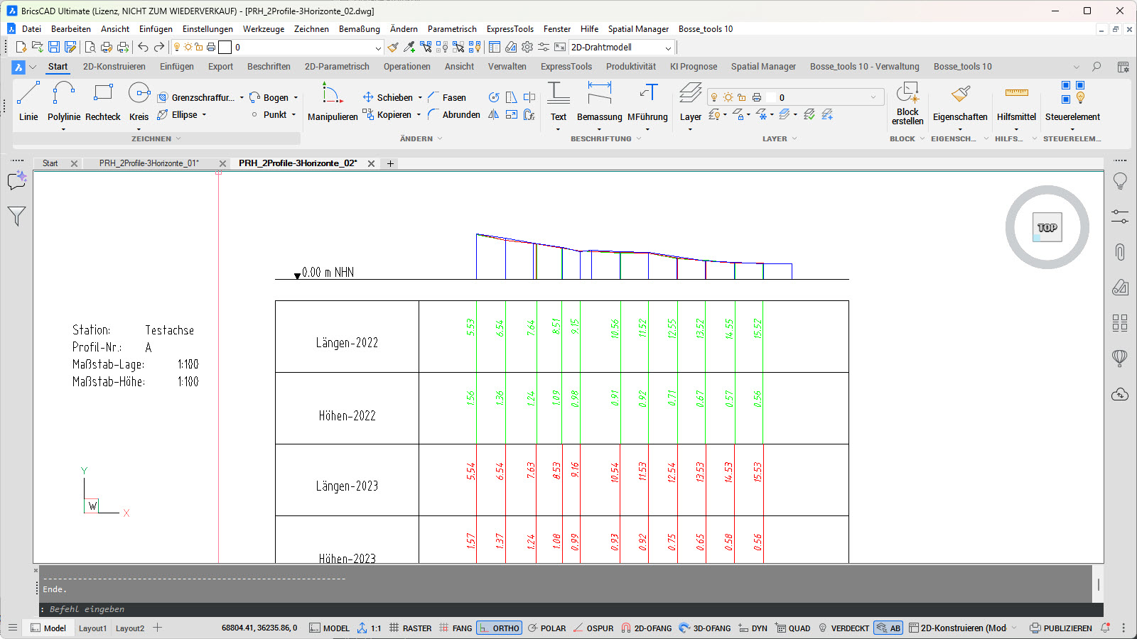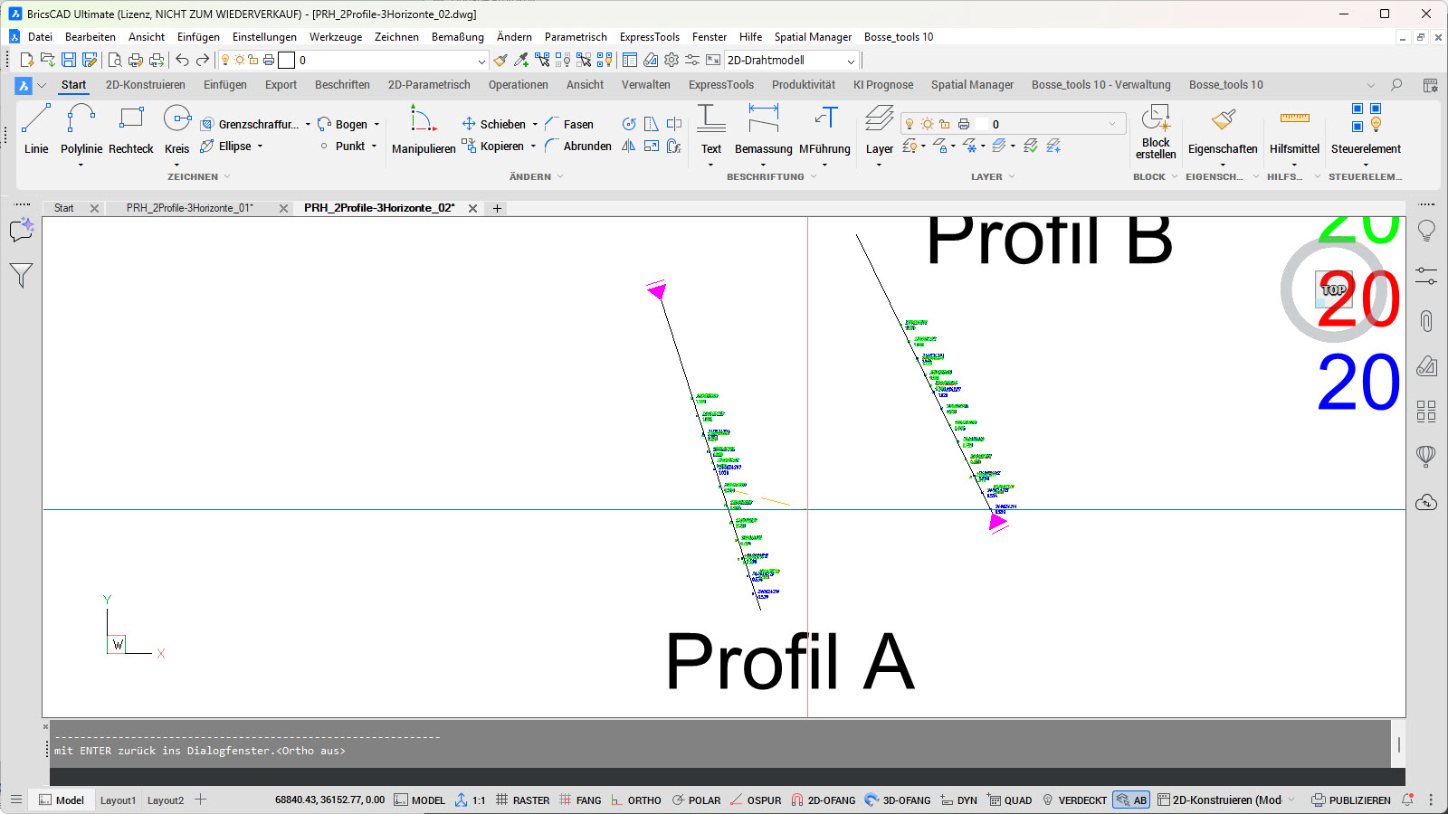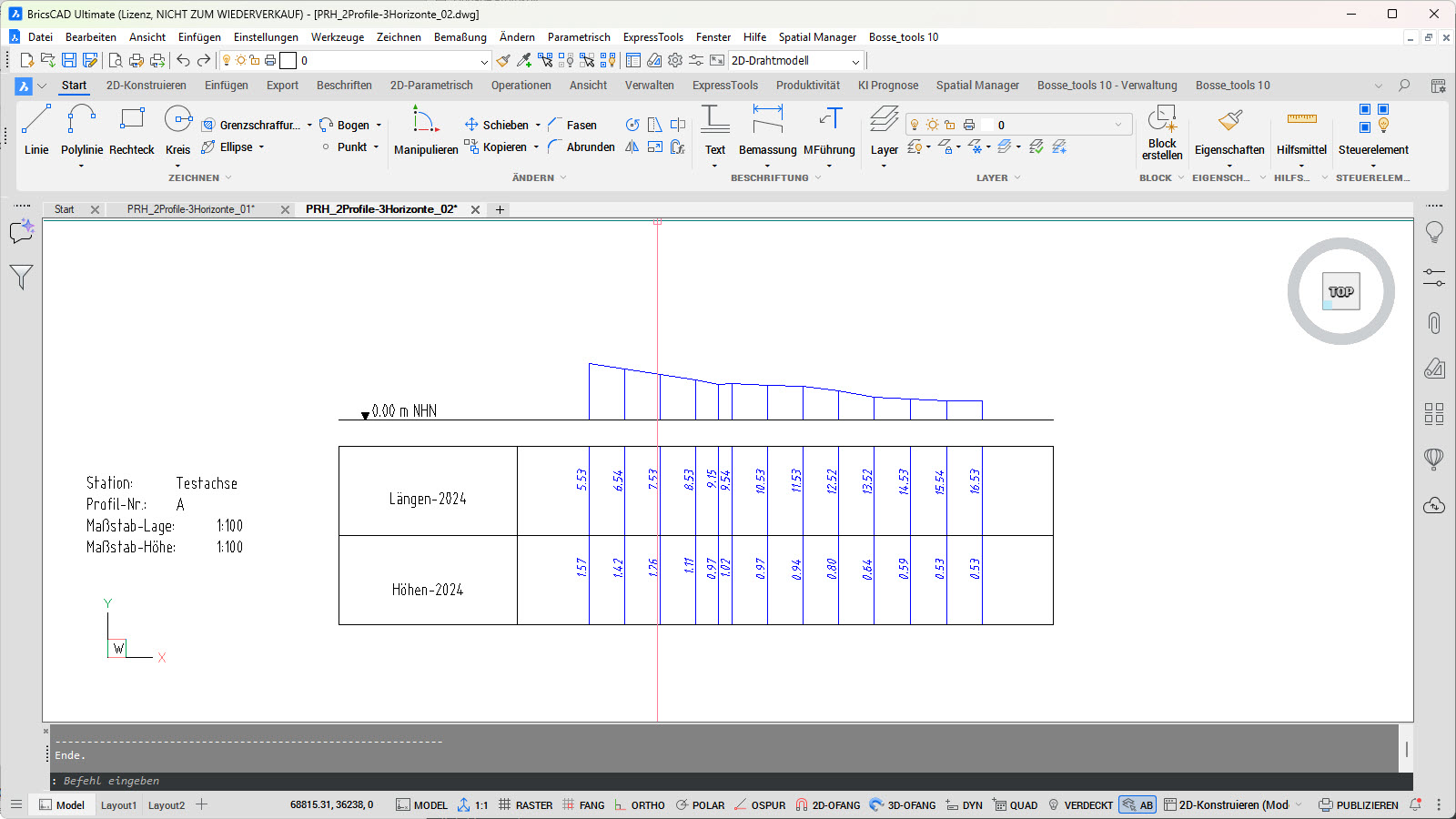 Zu jeder Profil-Linie können 1 oder mehrere Horizonte erstellt werden. Die Horizonte beinhalten die Koordinaten von 3D-Punktblöcken, die jeweils lotrecht auf die Profil-Linie angerechnet werden. Jeder Horizont kann in der Zeichnung erstellt werden, die zugehörigen Längen und Höhen werden beschriftet.