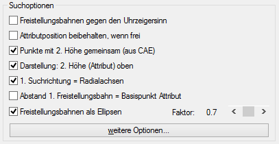 Sie können ein weiteres Attribut freistellen. Das erste und zweite Attribut werden gemeinsam freigestellt. Welches Attribut nach der Freistellung oben steht wird durch die Auswahl des ersten und zweiten Attributes bestimmt. Zudem kann die Reihenfolge durch das Häkchen "Darstellung 2.Höhe (Attribut) oben" im Bereich "Suchoptionen" umgekehrt werden. Wenn 2 Attribute gemeinsam freigestellt werden, können keine Punkte mit 2. Höhe gesondert behandelt werden.