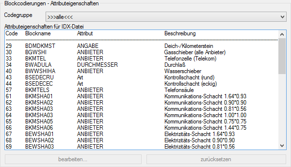 Wenn das alphanumerische Codierungsverfahren verwendet wird können die Eigenschaften der (AutoCAD/BricsCAD)-Attribute bearbeitet werden. Es öffnet sich das Dialogfenster "Attributeigenschaften für IDX-Datei".