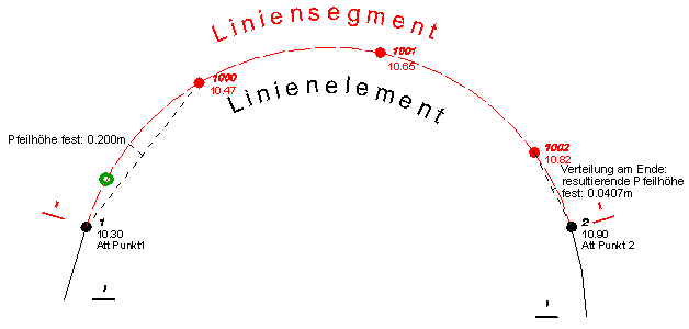 Es werden 3 neue Punktblöcke eingefügt. Die Anordnung erfolgt gleichmäßig auf dem Liniensegment, die Pfeilhöhe des Bogenabschnittes zwischen 2 Punktblöcken beträgt 0.20m. Am Ende des Liniensegmentes beträgt die Pfeilhöhe lediglich 0.0407m. Dieses Maß ergibt sich aus der Differenzlänge L - 3 *A, wobei L = Länge des Liniensegmentes, A = Abstand zwischen zwei Punktblöcken mit der Pfeilhöhe 0.20m ist.
