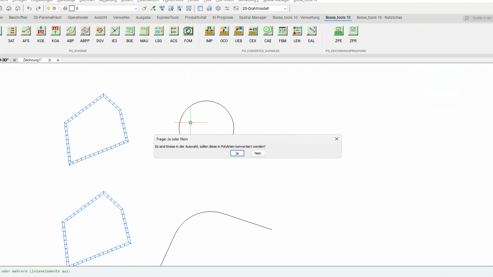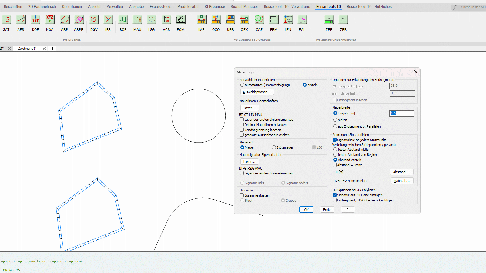 Mit diesem Programm werden Mauersignaturen an ausgewählten Linienzügen erstellt. Über eine Linienverfolgung oder Einzelobjektauswahl (Linien, (2D/3D/LW)-Polylinien,Bögen,Kreise) werden Linienzüge erkannt. Die Breite der Mauer kann vorgegeben werden oder sie wird automatisch aus Länge und Winkel eines Endsegmentes berechnet.