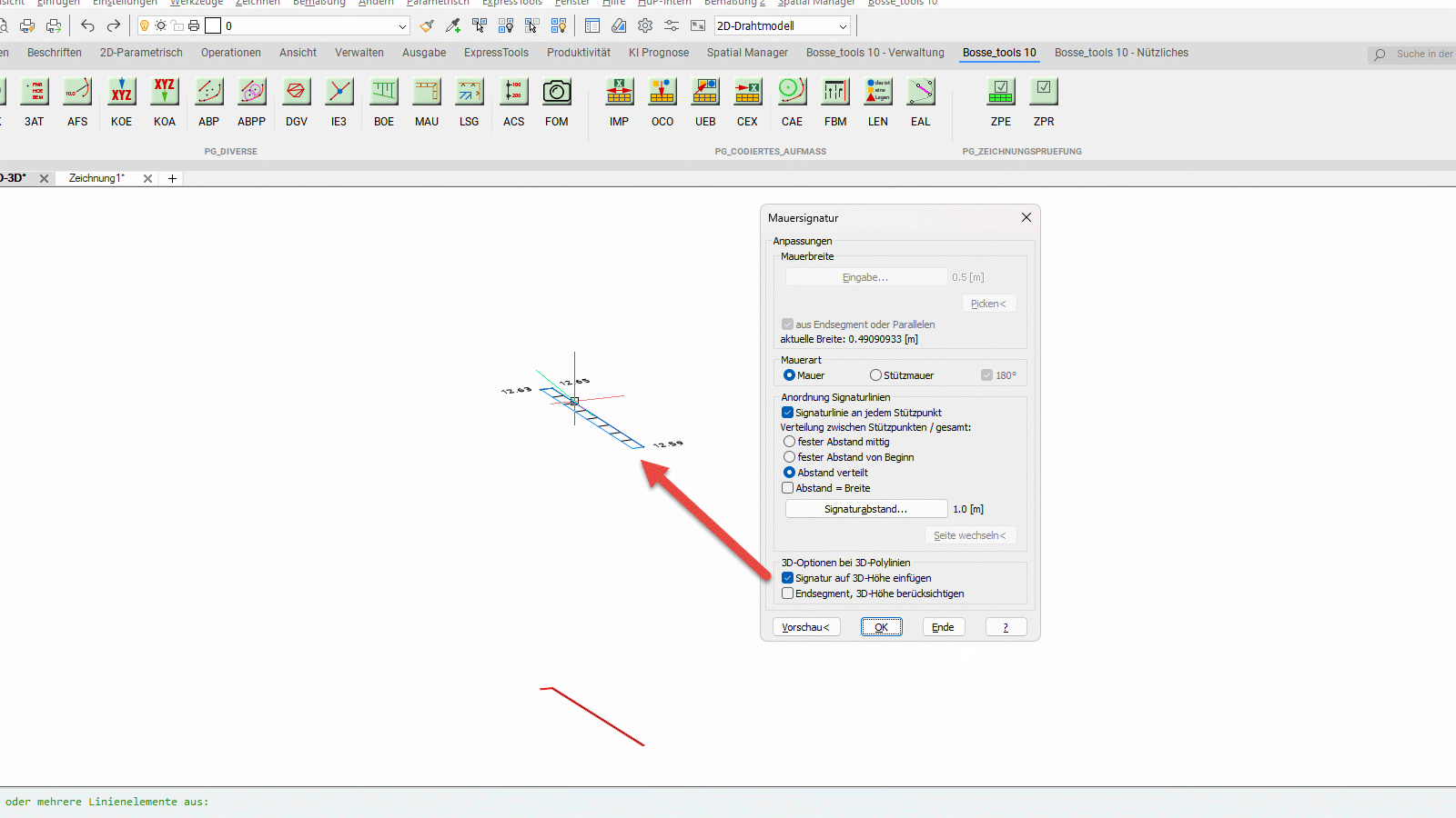 - Auswahl von Mauerlinien-Objekten über Linienverfolgung oder über eine Einzelobjektauswahl.