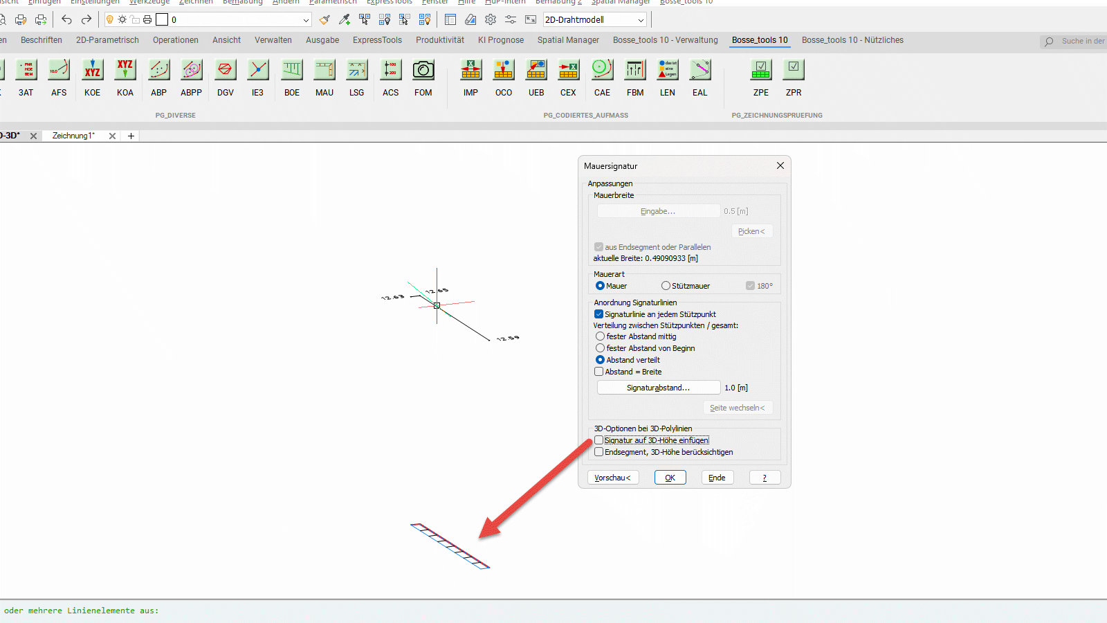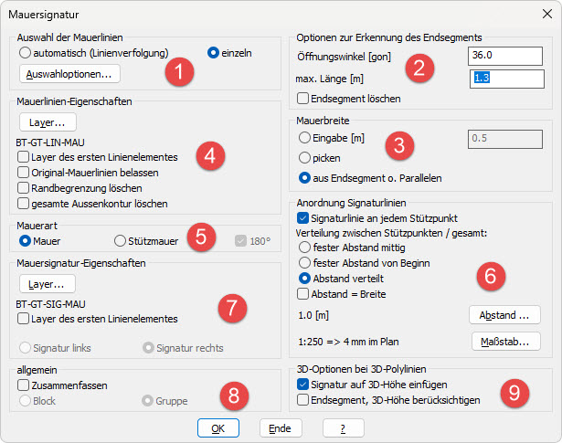 - Mauerart (als Stützmauer werden die Signaturlinien um 30° geneigt eingefügt).